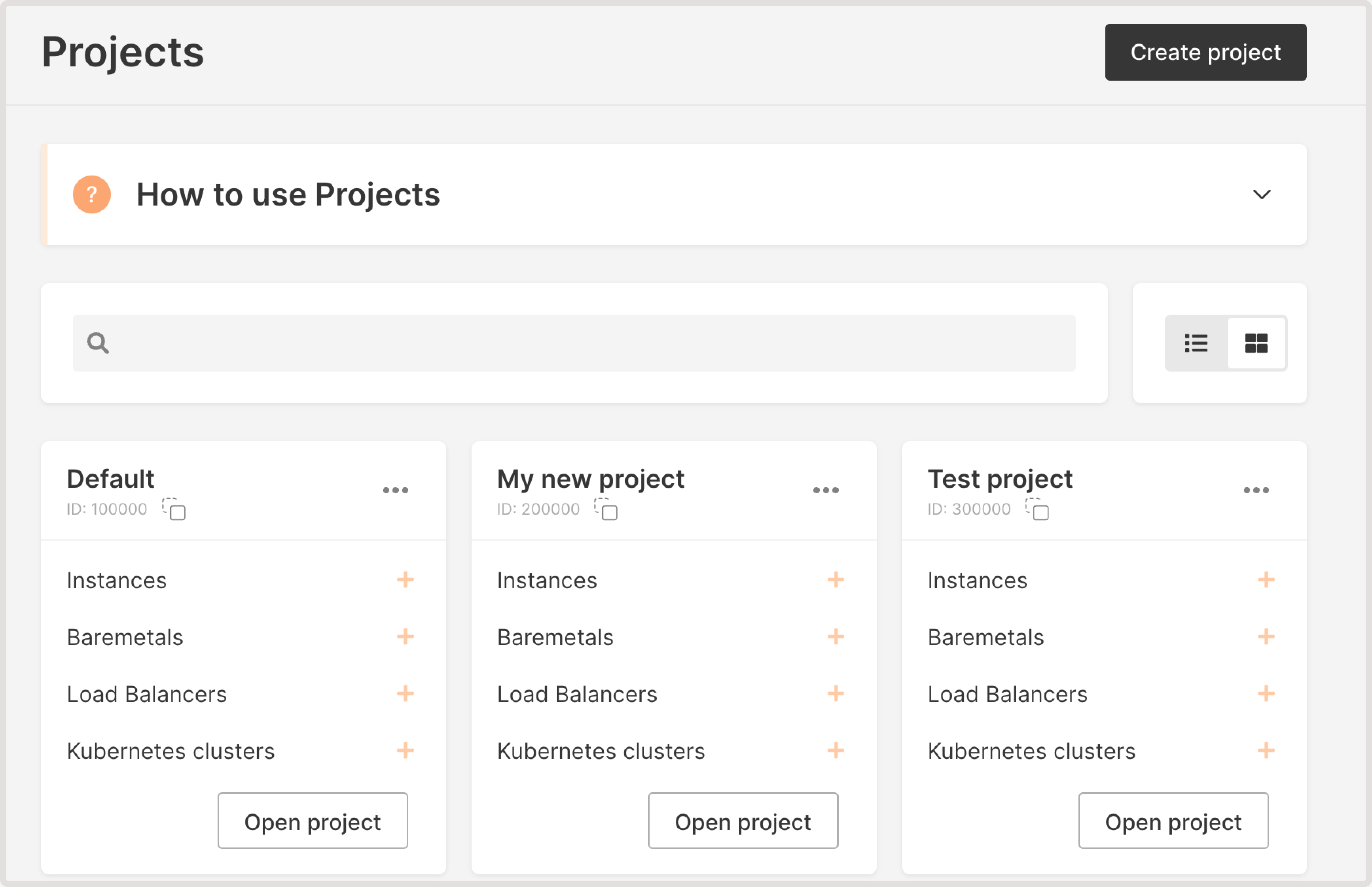 When you first navigate to the Cloud page, you’ll have only one Default project. This project is created automatically for every account and can’t be deleted. You can create more projects to organize your cloud resources. The number of projects doesn’t affect your expenses, you only pay for resources used. To create a project: 1. Navigate to the Projects page. 2. In the upper-right corner of the screen, select Create project.